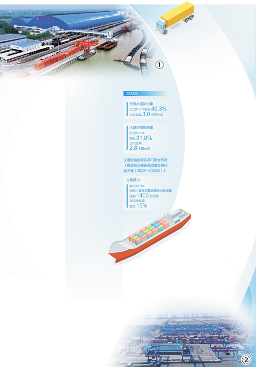 看运输总量,作为绿色低碳运输方式,水运在全部货运量中的占比不断提高。2023年,全国水路货运量比2017年增长40.3%,占比提高3.0个百分点;水路货物周转量比2017年增长31.8%,占比提高2.8个百分点。